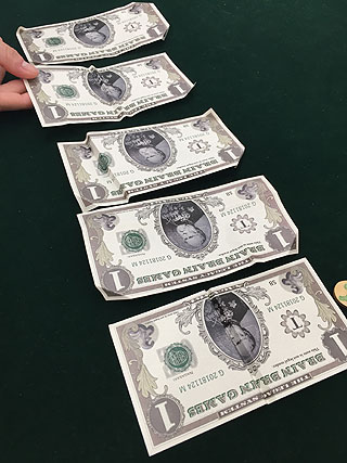 4) お札はシャッフルして並び順をランダムにした後、伏せた状態でテーブルに並べます。