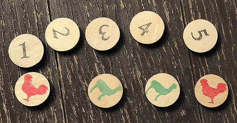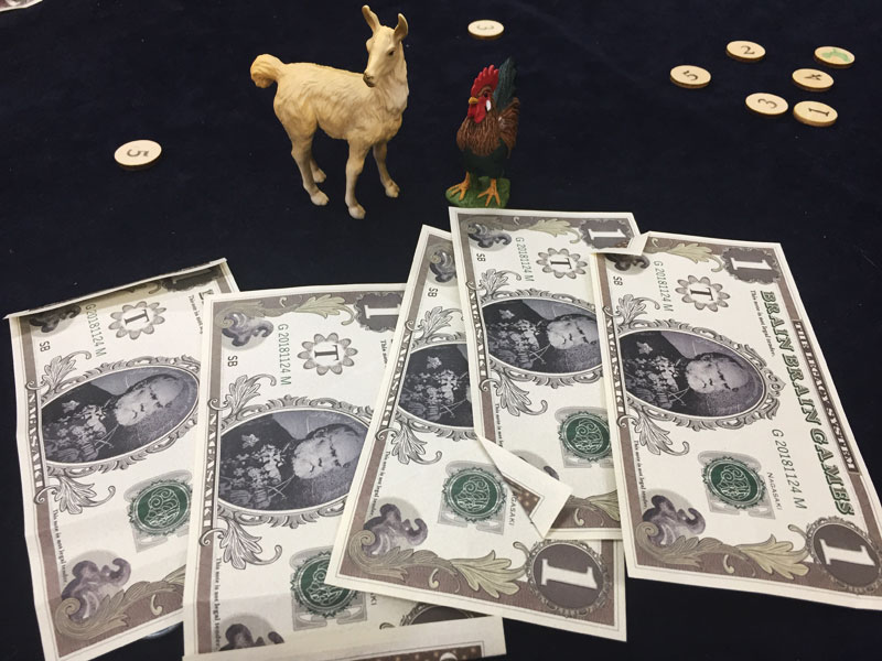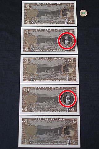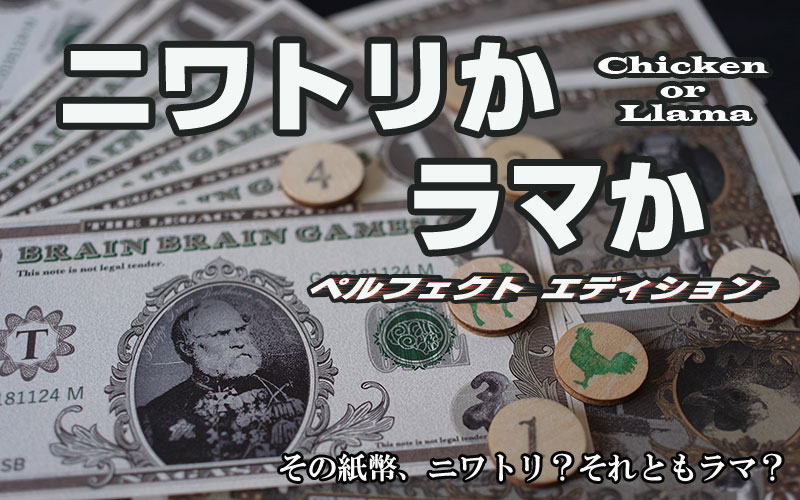 表面は同じだが、裏面にニワトリかラマが描かれているお札を並べ、それらがどちらなのかをチームごとに当てていくゲーム。