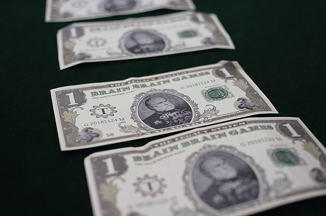お札を使ったチーム戦!ゲーム開始時に作戦会議あり!お札に自由に折り目をつけて仲間だけへのサインを仕込む!進むにつれお互いのサインで大混乱&お札への愛着がw