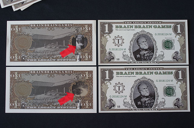 このゲームのお札はオモテ面はすべて同じですが、