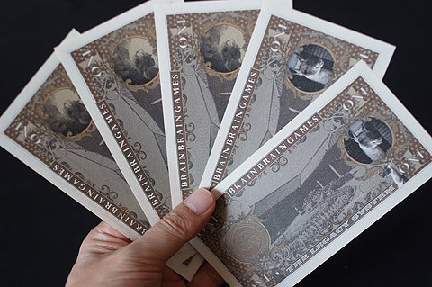 お札に目印をつけるフェーズはこのゲームの肝&一番楽しい瞬間でしたが、それ以外の人たちは特にやることがなく待ち時間となっていました。そこを4人同時に目印をつけることで待ち時間が無くなりゲーム展開がスムーズになりました。これに対応するため、お札の枚数は全部で40枚となっています。