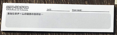 チームで折り方等の暗号を決めて、5枚の内ニワトリかラマか少ない方を当てるゲーム。