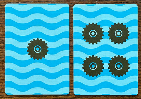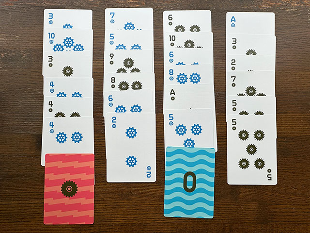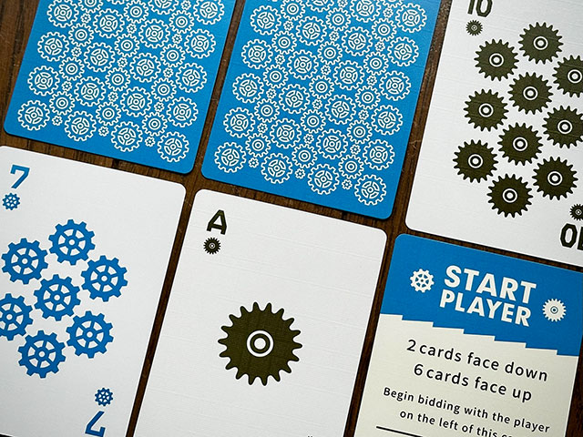 ギアプレイ。オープン手札6とクローズ手札2でやる2スートA(1)~10までのトリテ。オープン手札の6枚は所持点を払って競りで手に入れるので払い過ぎには注意が必要。若干ルールが複雑で誤読しやすい部分があるので